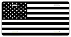 This 12"x6" novelty license plate features a black and white United States flag design. Made of quality aluminum with fade resistant sublimated artwork and a gloss finish. Lightweight and durable with pre-drilled holes for quick and easy mounting. Individually shrink-wrapped and proudly made in the USA.