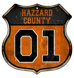 This highway shield metal sign features the iconic 01 symbol with the words "Hazzard County" over a simulated rusted background. Made of quality aluminum with fade resistant sublimated artwork and a gloss finish. Lightweight and durable with pre-drilled holes for quick and easy mounting. Individually shrink-wrapped and proudly made in the USA. Available in two sizes: S (5"x5") and L (11"x11").