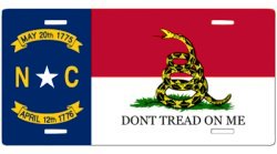 This novelty 12"x6" license plate combines the North Carolina State flag and the Gadsden Dont Tread On Me design. Made of quality aluminum with fade resistant sublimated artwork and a gloss weather resistant finish. Lightweight and durable with pre-drilled holes for quick and easy mounting. Individually shrink-wrapped and proudly made in the USA.
