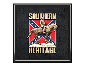 This elegant jewelry box features the Robert E. Lee monument in Richmond and an Army of Northern Virginia battle flag with the words "Southern Heritage." Made of high-quality varnished rubberwood with a soft felt interior lining and a glossy ceramic tile lid. Measures 6"x6". Available in Ebony Black only.