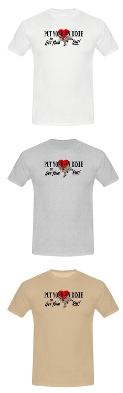 This one-sided t-shirt features a red heart and a cartoon donkey with the words, "Put Your [Heart] in Dixie or Get Your [Ass] Out!" Made of durable 100% cotton with quality full-color art. Available in ash gray, white or butternut. Also available in long sleeve.